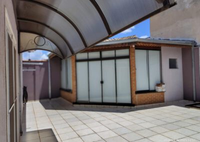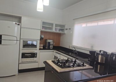 * Área gourmet (quiosque) com uma despensa e um banheiro. Balcão e pia em granito e churrasqueira. Porta e janelas de correr de blindex e persianas.