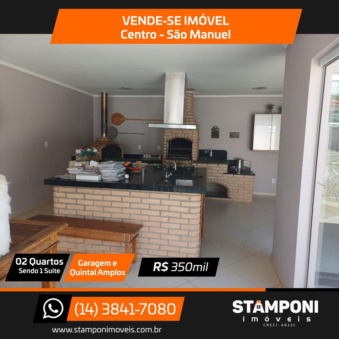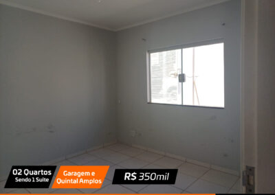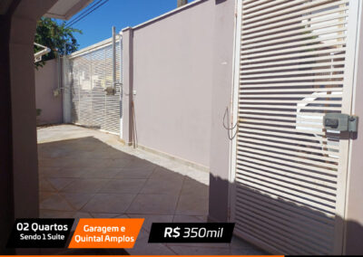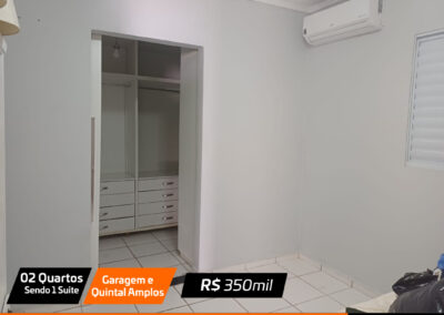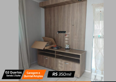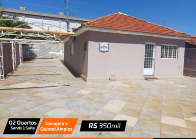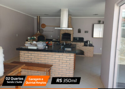 2 Quartos (1 suíte e closet), sala e cozinha, área externa com churrasqueira completa (forno e fogão a lenha), ilha com coifa, cooktop e pia – lavanderia, banheiro e escritório